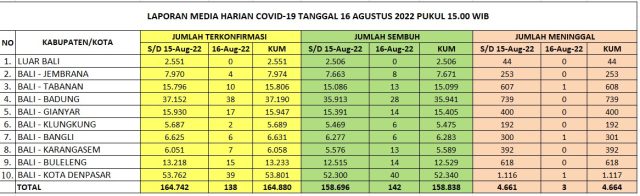 Kasus baru covid-19 di Bali pada Selasa (16/8/2022) bertambah 138 yang terdiri atas 122 warga negara Indonesia (WNI) dan 16 warga negara asing (WNA), sementara kasus sembuh bertambah 142 orang. Kasus meninggal tiga orang. Data ini diperoleh dari Satgas Penanganan Covid-19 Bali melalui Humas Pemprov Bali.