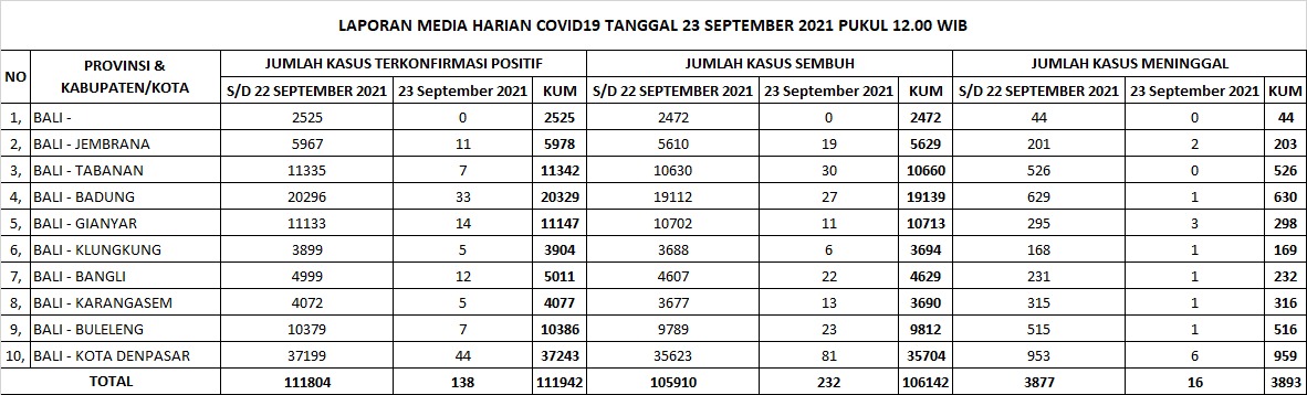 Kasus baru covid-19 di Bali pada Kamis (23/9/2021) bertambah 138 orang, sementara kasus sembuh bertambah 232 orang. Kasus meninggal bertambah 16 orang. Data ini diperoleh dari Satgas Penanganan Covid-19 Bali melalui Humas Pemprov Bali.