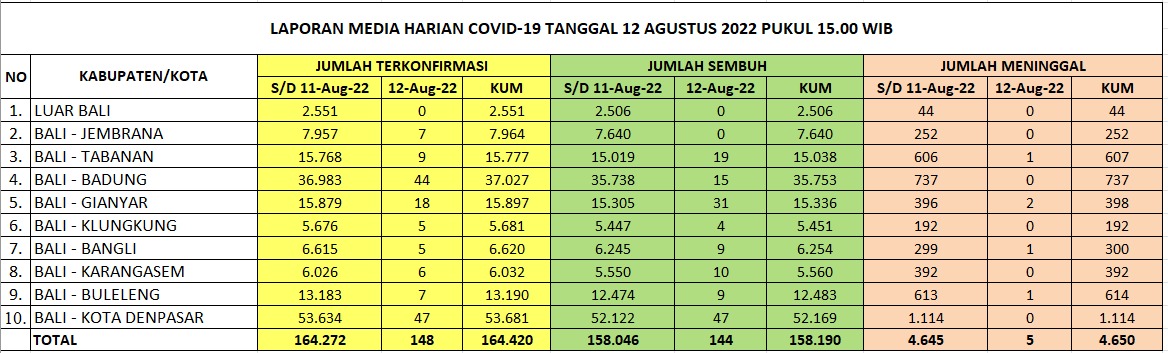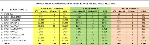 Kasus baru covid-19 di Bali pada Jumat (12/8/2022) bertambah 148 yang terdiri atas 130 warga negara Indonesia (WNI) dan 18 warga negara asing (WNA), sementara kasus sembuh bertambah 144 orang. Kasus meninggal lima orang. Data ini diperoleh dari Satgas Penanganan Covid-19 Bali melalui Humas Pemprov Bali.