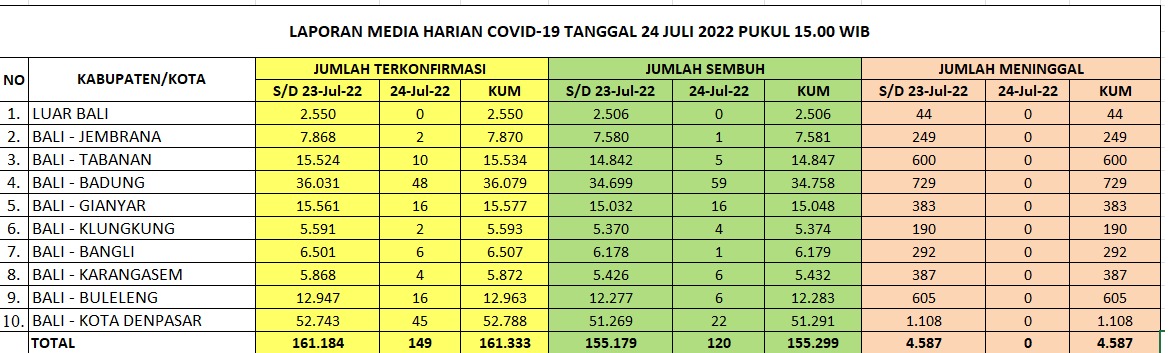 Kasus baru covid-19 di Bali pada Minggu (24/7/2022) bertambah 149 yang terdiri atas 130 warga negara Indonesia (WNI) dan 19 warga negara asing (WNA), sementara kasus sembuh bertambah 120 orang. Kasus meninggal nihil. Data ini diperoleh dari Satgas Penanganan Covid-19 Bali melalui Humas Pemprov Bali.