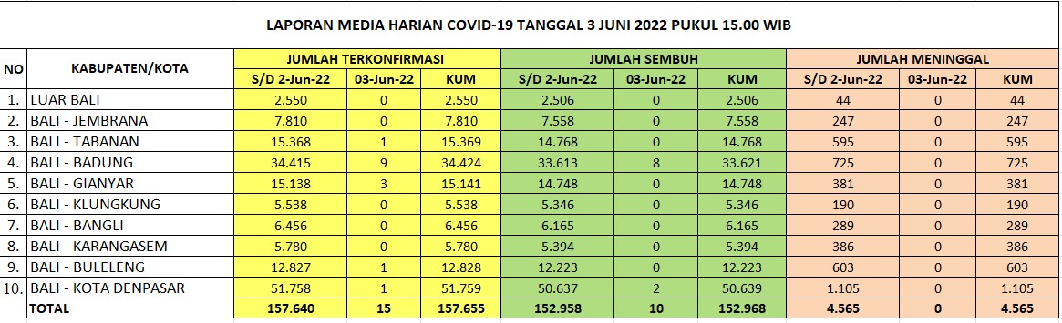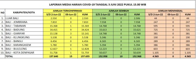 Kasus baru covid-19 di Bali pada Jumat (3/6/2022) bertambah 15 orang, sementara kasus sembuh bertambah 10 orang. Kasus meninggal nihil. Data ini diperoleh dari Satgas Penanganan Covid-19 Bali melalui Humas Pemprov Bali.