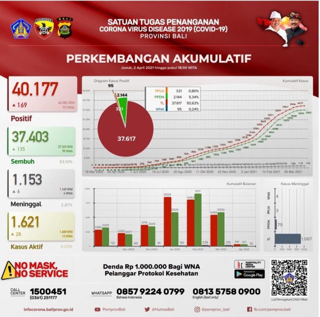 Pertambahan kasus covid-19 Bali pada Jumat (2/4) hari ini, terkonfirmasi 169 orang (146 orang melalui transmisi lokal dan 23 PPDN), sembuh 135 orang, dan 6 orang meninggal dunia.