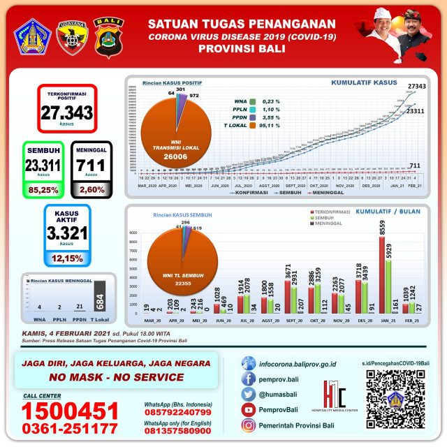 Perkembangan pandemi covid-19 di Provinsi Bali per Kamis (4/2) hari ini mencatat pertambahan kasus terkonfirmasi 216 orang (190 orang melalui transmisi lokal dan 26 PPDN), sembuh 365 orang, dan 9 orang meninggal dunia.