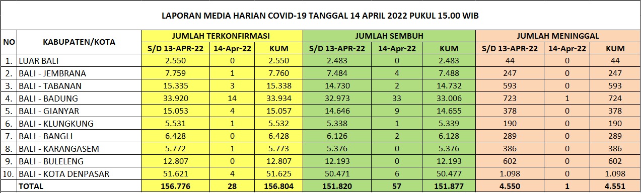 Kasus baru covid-19 di Bali pada Kamis (14/4/2022) bertambah 28 orang, sementara kasus sembuh bertambah 57 orang. Kasus meninggal satu orang. Data ini diperoleh dari Satgas Penanganan Covid-19 Bali melalui Humas Pemprov Bali.