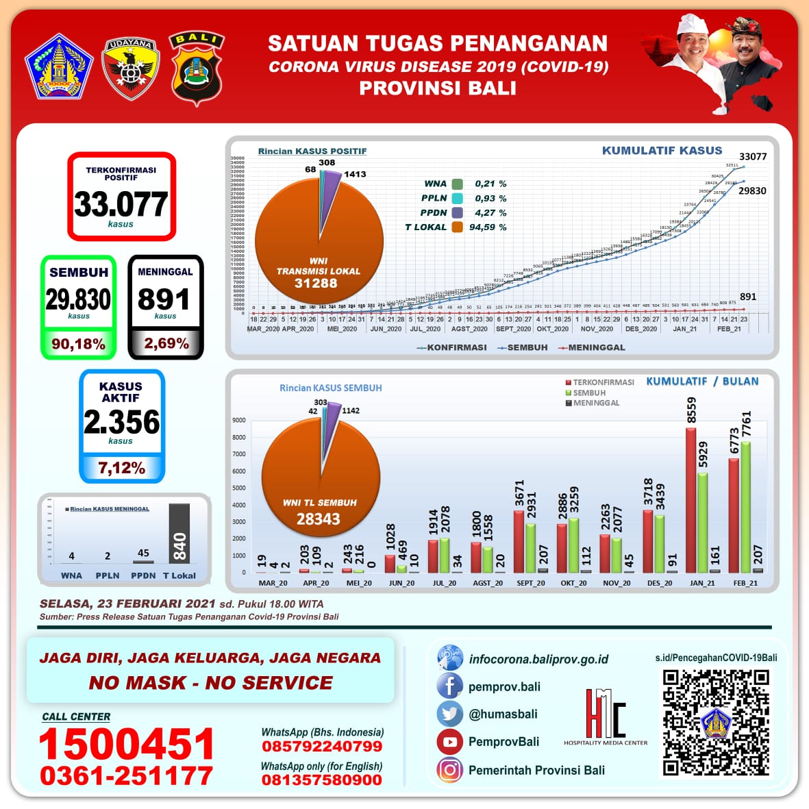 Jumlah kasus secara kumulatif sebagai berikut, terkonfirmasi positif 33.077 orang, sembuh 29.830 orang (90,18%), dan meninggal dunia 891 orang (2,69%). Kasus aktif per hari ini menjadi 2.356 orang (7,12%).