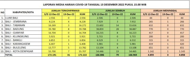Kasus baru covid-19 di Bali pada Selasa (13/12/2022) bertambah 31, sementara kasus sembuh bertambah 79 orang. Kasus meninggal tiga orang. Data ini diperoleh dari Satgas Penanganan Covid-19 Bali melalui Humas Pemprov Bali.