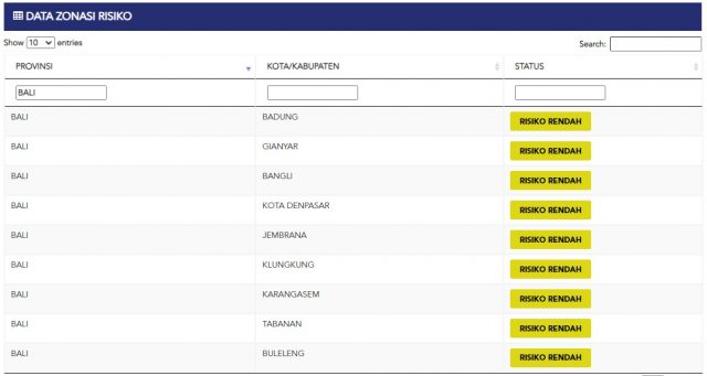 Delapan kabupaten dan satu kota di Bali masuk zone kuning dengan risiko rendah. Kesembilan kabupaten kota tersebut adalah Kabupaten Badung, Gianyar, Klungkung, Bangli, Tabanan, Kabupaten Jembrana, Karangasem, Buleleng, dan Kota Denpasar. (sar/hmbal)
