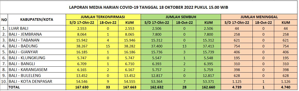 Kasus baru covid-19 di Bali pada Selasa (18/10/2022) bertambah 33 yang terdiri atas 28 warga negara Indonesia (WNI) dan 5 warga negara asing (WNA), sementara kasus sembuh bertambah 28 orang. Kasus meninggal satu orang. Data ini diperoleh dari Satgas Penanganan Covid-19 Bali melalui Humas Pemprov Bali.