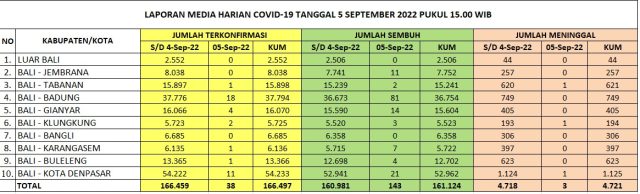 Kasus baru covid-19 di Bali pada Senin (5/9/2022) bertambah 38 yang terdiri atas 31 warga negara Indonesia (WNI) dan 7 warga negara asing (WNA), sementara kasus sembuh bertambah 143 orang. Kasus meninggal tiga orang. Data ini diperoleh dari Satgas Penanganan Covid-19 Bali melalui Humas Pemprov Bali.