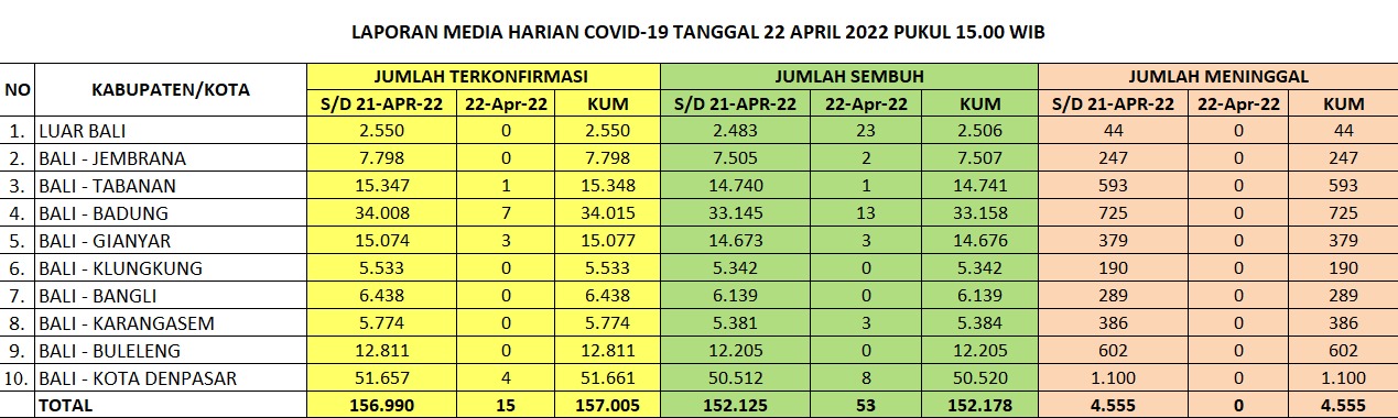 Kasus baru covid-19 di Bali pada Jumat (22/4/2022) bertambah 15 orang, sementara kasus sembuh bertambah 53 orang. Kasus meninggal nihil. Data ini diperoleh dari Satgas Penanganan Covid-19 Bali melalui Humas Pemprov Bali.
