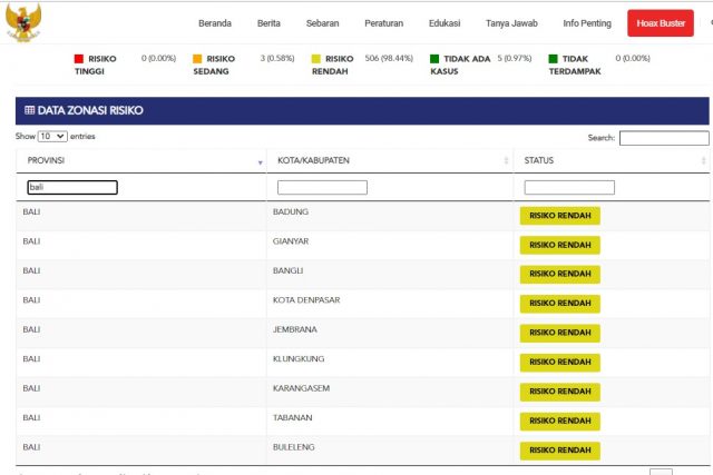 Delapan kabupaten dan satu kota di Bali masuk zone kuning dengan risiko rendah. Kesembilan kabupaten kota tersebut adalah Kabupaten Badung, Gianyar, Klungkung, Bangli, Tabanan, Kabupaten Jembrana, Karangasem, Buleleng, dan Kota Denpasar. (sar/hmbal)