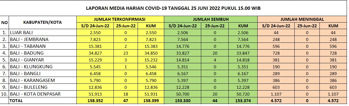 Kasus baru covid-19 di Bali pada Sabtu (25/6/2022) bertambah 47 yang terdiri atas 36 warga negara Indonesia (WNI) dan 11 warga negara asing (WNA), sementara kasus sembuh bertambah 44 orang. Kasus meninggal nihil. Data ini diperoleh dari Satgas Penanganan Covid-19 Bali melalui Humas Pemprov Bali.