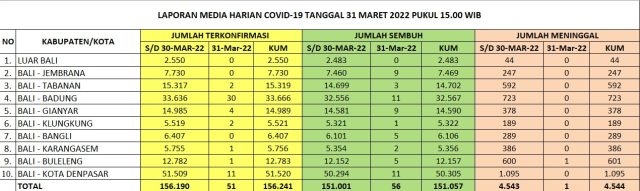 Kasus baru covid-19 di Bali pada Kamis (31/3/2022) bertambah 51 orang, sementara kasus sembuh bertambah 56 orang. Kasus meninggal satu orang. Data ini diperoleh dari Satgas Penanganan Covid-19 Bali melalui Humas Pemprov Bali.