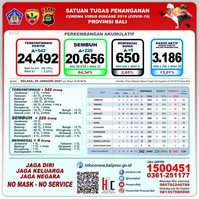 Perkembangan pandemi covid-19 di Provinsi Bali per Selasa (26/1/2021) hari ini mencatat pertambahan kasus terkonfirmasi 542 orang (493 orang melalui transmisi lokal, 48 PPDN dan 1 PPLN), sembuh 229 orang, dan 9 orang meninggal dunia.