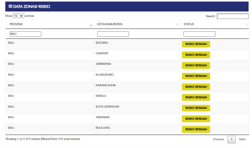 Data lain menyebutkan, delapan kabupaten dan satu kota di Bali masuk zone kuning dengan risiko rendah. Kesembilan kabupaten kota tersebut adalah Kabupaten Badung, Gianyar, Klungkung, Bangli, Tabanan, Kabupaten Jembrana, Karangasem, Buleleng, dan Kota Denpasar. (sar/hmbal)