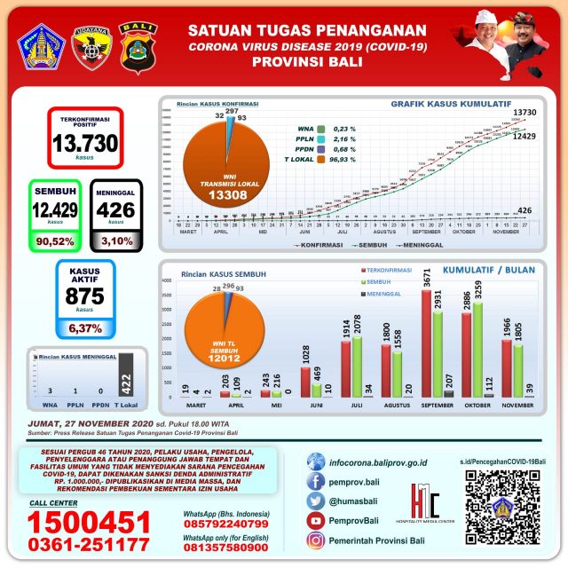 Perkembangan pandemi covid-19 di Provinsi Bali per hari Jumat (27/11/2020) mencatat pertambahan kasus terkonfirmasi 82 orang melalui transmisi lokal. Sembuh 53 orang, dan 3 orang meninggal dunia.
