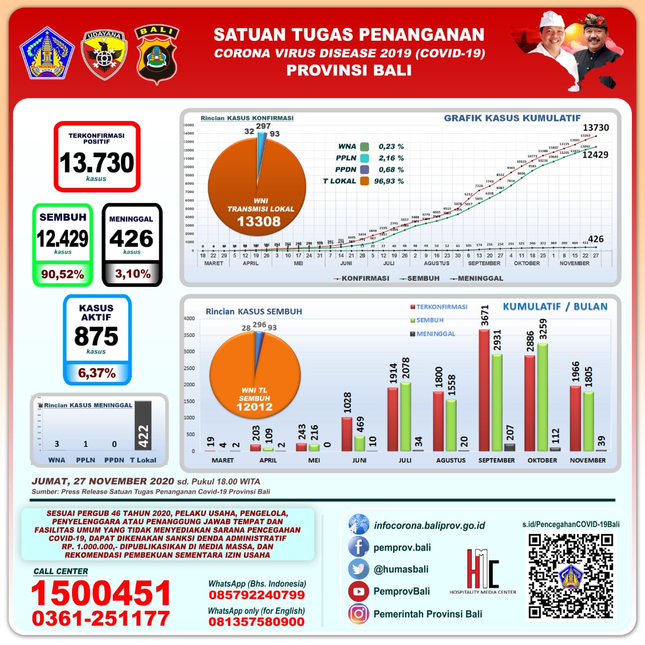 Jumlah kasus secara kumulatif sebagai berikut, terkonfirmasi positif 13.730 orang, sembuh 12.429 orang (90,52%), dan meninggal dunia 426 orang (3,10%). Kasus aktif per hari ini menjadi 875 orang (6,37%), yang tersebar dalam perawatan di 17 RS rujukan, dan dikarantina di Bapelkesmas, UPT Nyitdah, Wisma Bima dan BPK Pering.