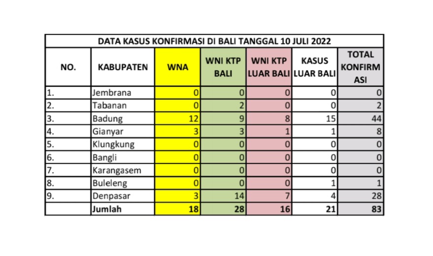 Kasus baru covid-19 di Bali pada Minggu (10/7/2022) bertambah 83 yang terdiri atas 65 warga negara Indonesia (WNI) dan 18 warga negara asing (WNA), sementara kasus sembuh bertambah 29 orang. Kasus meninggal nihil. Data ini diperoleh dari Satgas Penanganan Covid-19 Bali melalui Humas Pemprov Bali.