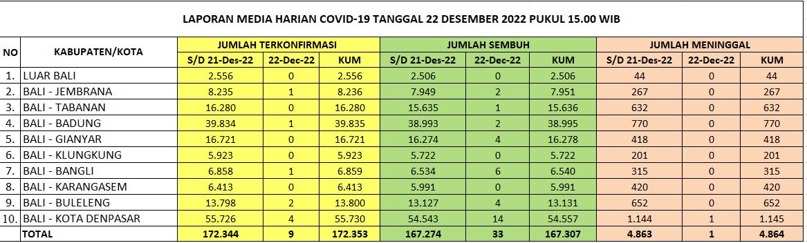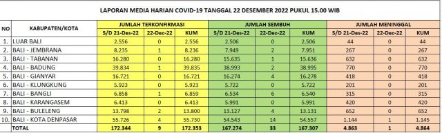Kasus baru covid-19 di Bali pada Kamis (22/12/2022) bertambah 9, sementara kasus sembuh bertambah 33 orang. Kasus meninggal satu orang. Data ini diperoleh dari Satgas Penanganan Covid-19 Bali melalui Humas Pemprov Bali.