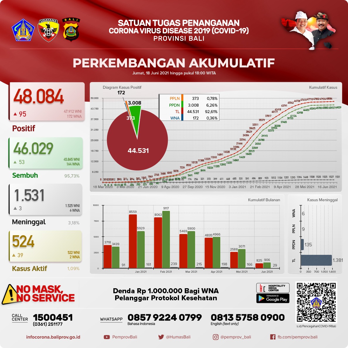 sembuh 46.029 orang (95,73%), dan meninggal dunia 1.531 orang (3,18%). Kasus aktif per hari ini menjadi 524 orang (1.09%).