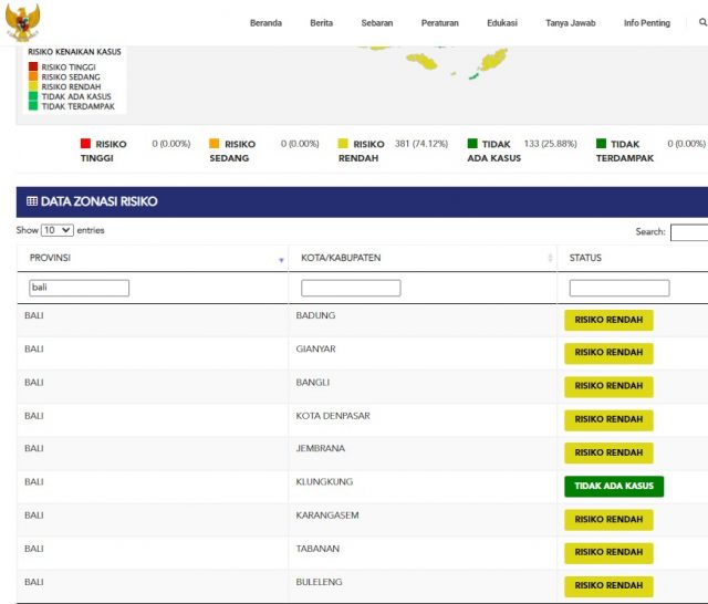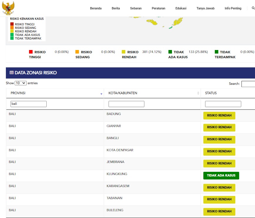Tujuh kabupaten dan satu kota di Bali masuk zone kuning dengan risiko rendah dan satu kabupaten masuk zone hijau. Kesembilan kabupaten kota tersebut adalah Kabupaten Badung, Gianyar, Klungkung (hijau), Bangli, Tabanan, Kabupaten Jembrana, Karangasem, Buleleng, dan Kota Denpasar. (sar/hmbal)