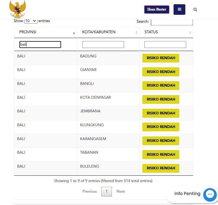 Delapan kabupaten dan satu kota di Bali masuk zone kuning dengan risiko rendah. Kesembilan kabupaten kota tersebut adalah Kabupaten Badung, Gianyar, Klungkung, Bangli, Tabanan, Kabupaten Jembrana, Karangasem, Buleleng, dan Kota Denpasar. (sar/hmbal)
