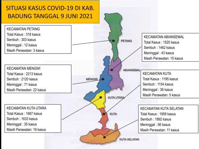 Pada Rabu (9/6) hari ini, ada tambahan 1 kasus positif/konfirmasi sehingga total kumulatif kasus positif/konfirmasi covid-19 di Kabupaten Badung kini menjadi 8.892 orang. Hal ini diungkapkan Koordinator Kehumasan GTPP Covid-19 Badung GN Jaya Saputra.