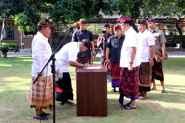 SUMPAH – Sekda Dewa Made Indra pada Upacara Pelantikan dan Pengambilan Sumpah/Janji Jabatan Fungsional Polisi Pamong Praja di Halaman Kantor Pol PP Provinsi Bali, Kamis (12/12).