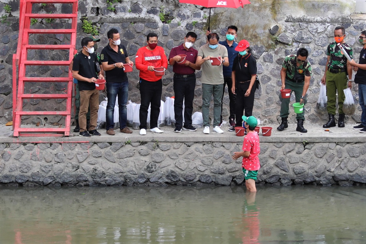 BENIH IKAN – Wakil Bupati Badung I Ketut Suiasa saat melepaskan benih ikan nila di kawasan Tukad Mati, Kamis (31/12).