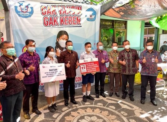 VAKSINASI – Sejumlah siswa berprestasi menerima tabungan simpanan pelajar seusai mendapatkan vaksinasi yang digelar OJK Bali yang berkolaborasi dengan BPD dan Bank Mandiri, Selasa (13/7).
