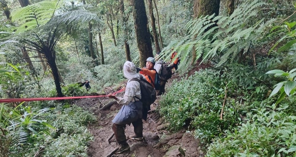 PROSES EVAKUASI – Proses evakuasi terhadap lima pendaki Gunung Batukaru yang mengalami kelelahan saat turun.