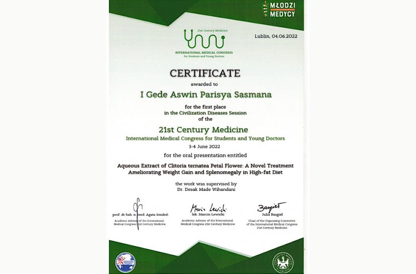 Berita gembira datang dari Fakultas Kedokteran Unud. Prestasi bertaraf internasional kembali diraih oleh mahasiswa Fakultas Kedokteran Unud dalam ajang “The 21st Century Medicine-International Medical Congress for Medical Student and Young Doctors”.