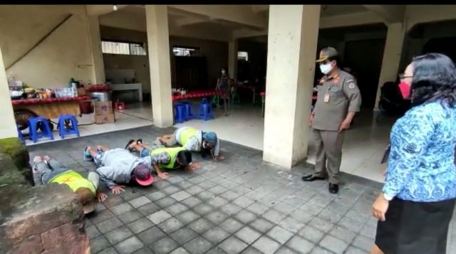 PUSH-UP – Sanksi push-up diberikan kepada para pelanggar prokes yang terjaring dalam penertiban, Rabu (17/11/2021).