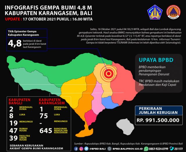 Kerugian material akibat gempa bumi bermagnitudo 4,8 di Karangasem hingga Minggu (17/10) mencapai Rp 991,5 juta. Korban tewas tetap 3 orang, satu di Karangasem dan dua di Bangli. Sementara korban luka mencapai 83 orang, di Karangasem 75 orang dan di Bangli 8 orang.