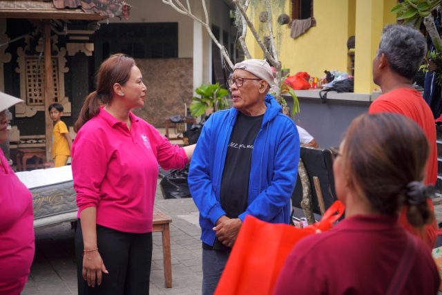 TERDAMPAK BENCANA – Ketua GOW Badung Nyonya Yunita Alit Sucipta mengunjungi warga masyarakat Badung yang terdampak bencana banjir di Desa Angantaka dan Kelurahan Sempidi Badung, Sabtu (13/9).