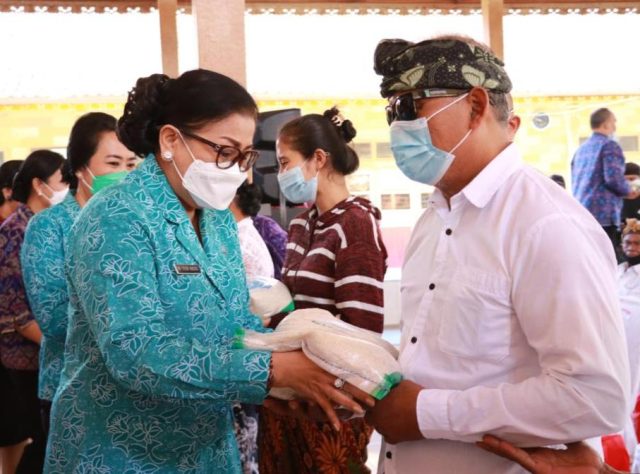 BANTUAN – Ketua TP PKK Provinsi Bali Ny. Putri Koster menyerahkan bantuan dalam acara berbakti dan berbagi di Kabupaten Bangli, Jumat (22/4/2022).