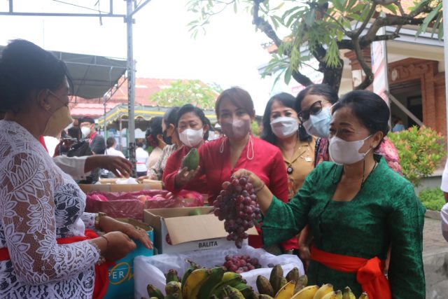 WARUNG MURAH – Ketua TP PKK Denpasar Ny. Antari Jaya Negara membuka warung murah PKK Desa Dauh Puri Kaja, Senin (1/11).