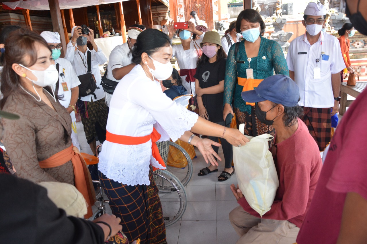 SEMBAKO – Ketua TP PKK Denpasar Ny. Antari Jaya Negara menyerahkan bantuan sembako saat meninjau vaksinasi disabilitas, Senin (6/9/2021).