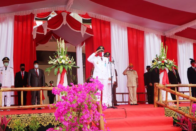 KEMERDEKAAN – Bupati Giri Prasta saat memimpin upacara peringatan HUT kemerdekaan RI di Kabupaten Badung, Senin (17/8/2020).