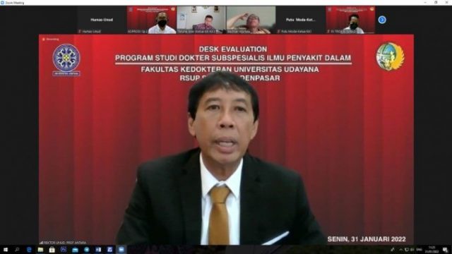 Program Studi Dokter Subspesialis Ilmu Penyakit Dalam FK Unud/RSUP Sanglah melakukan desk evaluation yang berlangsung secara daring melalui zoom meeting, Senin (31/1/2022). Kegiatan ini dihadiri Rektor Unud, Dekan dan Wakil Dekan FK, para Koprodi, LP3M, Ka UPT Perpustakaan, Dirut RSUP Sanglah, Ketua KKI dan jajaran serta undangan lainnya.