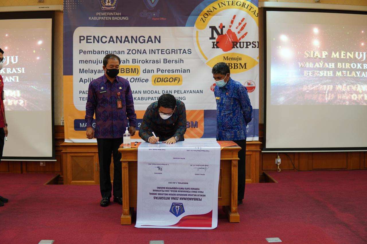 Komitmen Pemerintah Kabupaten Badung di dalam menuju zona integritas wilayah bebas korupsi (WBK) dan wilayah birokrasi bersih melayani (WBBM), pada Jumat (2/7), dilaksanakan penandatanganan perjanjian kinerja oleh Sekretaris Daerah Kabupaten Badung I Wayan Adi Arnawa beserta Kepala Ombudsman Bali Umar Ibnu Alkhatab dan Kepala Dinas Penanaman Modal dan Pelayanan Terpadu Satu Pintu (DPMPTSP) I Made Agus Aryawan di Mall Pelayanan Publik Puspem Badung. Pada kesempatan tersebut juga diresmikan Sistem Digital Office (DIGOF). Turut hadir Asisten Administrasi Umum Setda Badung Cokorda Raka Darmawan, pimpinan OPD terkait serta pejabat terkait di lingkungan Pemkab Badung.