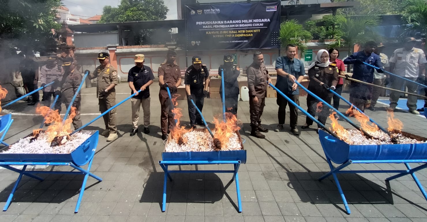 Sebagai rangkaian dari kegiatan Operasi Gempur Rokok Ilegal tahap kedua, Kanwil DJBC Bali, NTB, NTT dan Bea Cukai Denpasar Kamis, 23 November 2023 melaksanakan kegiatan pemusnahan barang milik negara (BMN) hasil penindakan di bidang cukai.