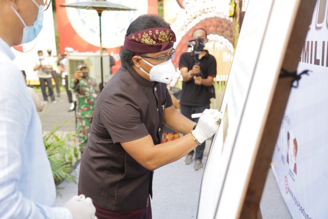 DAMAI – Nyoman Giri Prasta, cabup Badung, membubuhkan tanda tangan untuk kampanye sehat dan damai.