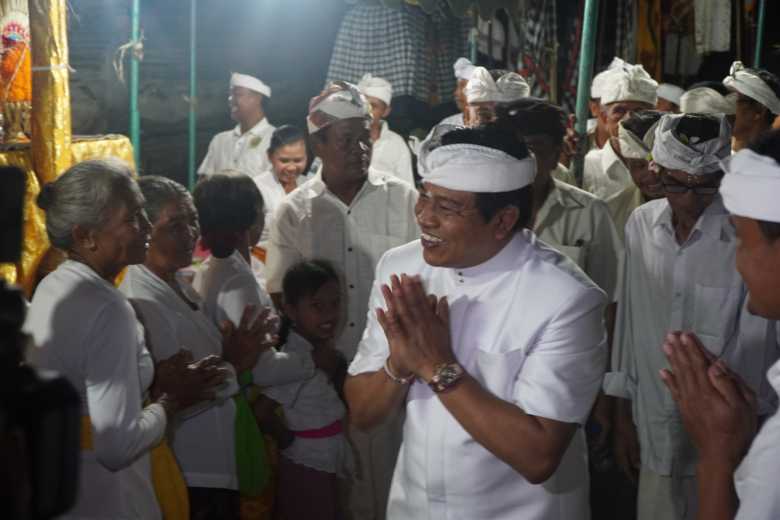 HADIRI PUJAWALI – Wayan Suyasa memenuhi undangan krama bertepatan pujawali di Pura Pasek Toh Jiwa, Desa Adat Kekeran, Kecamatan Mengwi.