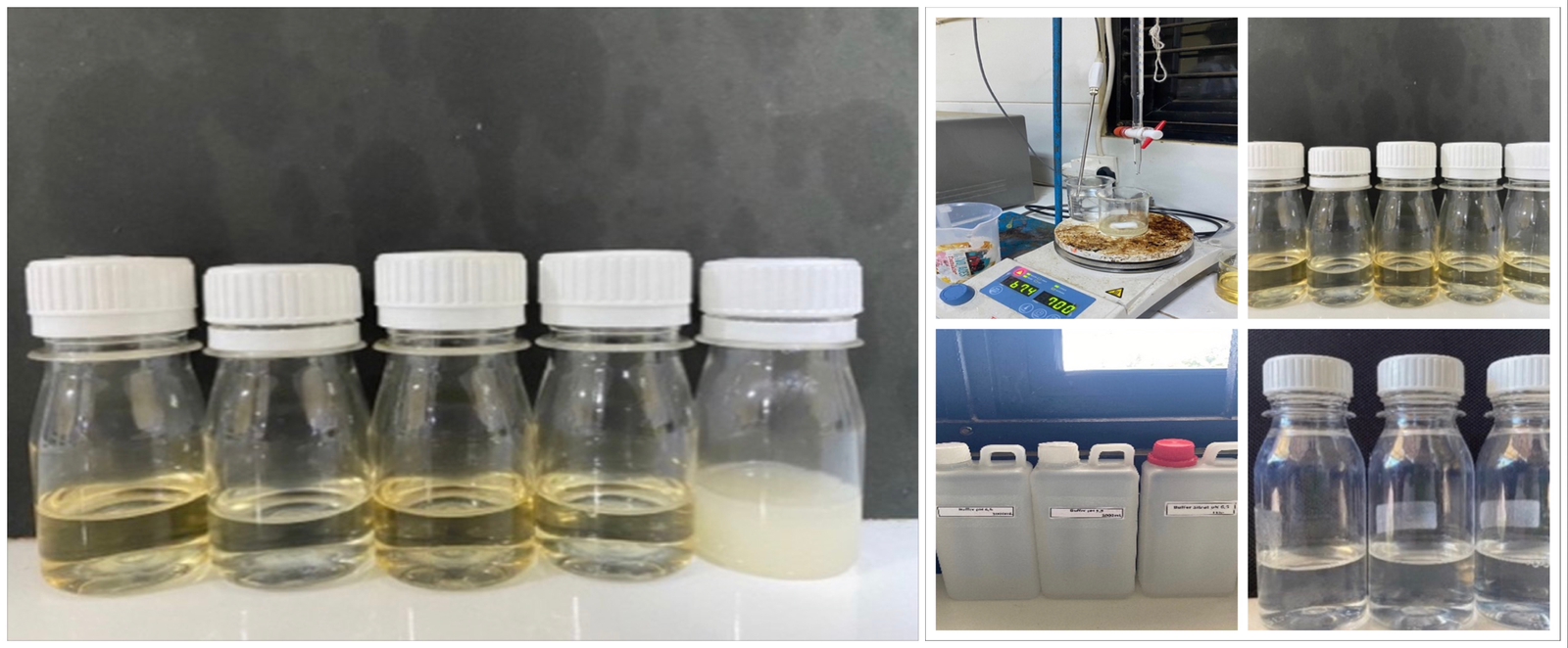 Pembuatan mikroemulsi minyak atsiri kenanga dibuat dari tiga jenis surfaktan non-ionik yaitu Tween 80, Tween 20 dan Span 80 dengan menggunakan 5 perlakuan. Setiap perlakuan diulang sebanyak 4 kali sehingga diperoleh 20 unit percobaan. Selanjutnya formulasi diaduk di atas hot plate menggunakan magnetic stirrer selama 4 menit dengan kecepatan 700 rpm, pada suhu 70oC ± 5oC. Proses pengadukan dilanjutkan dengan penambahan aquades tetes demi tetes sebanyak 10 ml agar larutan tidak menjendal. Selanjutnya dilakukan inkubasi selama 24 jam pada suhu ruang.