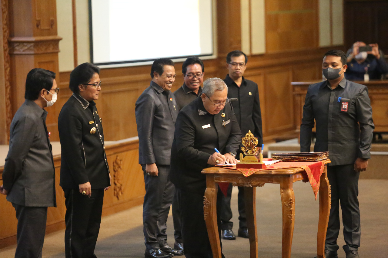 KUA PPAS – Ketua DPRD Badung Putu Parwata menandatangani penetapan KUA PPAS 2023 bersama Bupati Badung pada rapat paripurna Jumat (5/8/2022).