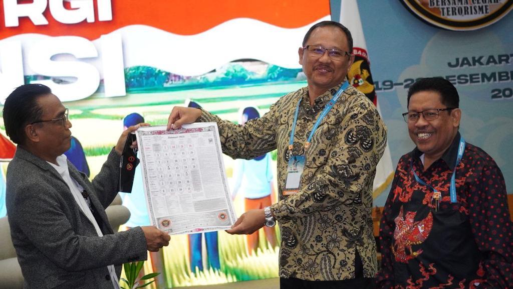 KALENDER BALI – Ketua FKPT Bali Ngurah Wiryanata menyerahkan kalender Bali sebagai kearifan lokal masyarakat Bali kepada Direktur Pencegahan BNPT Prof. Dr. Irfan Idris.