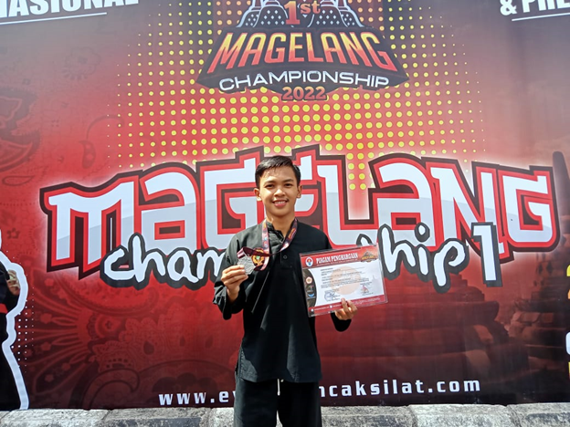 JUARA II – Mahasiswa FKH Unud Dimas Kholis Prasetiyo berhasil meraih juara II Kelas Putra A Tingkat Mahasiswa/Dewasa di Kejuaraan kegiatan pencak silat Magelang Open Tournament Tahun 2022.