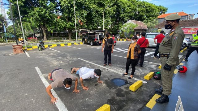 PUSH UP – Tim Yustisi memberi sanksi push up kepada pelanggar yang menggunakan masker secara tidak benar, Selasa (25/1/2022).