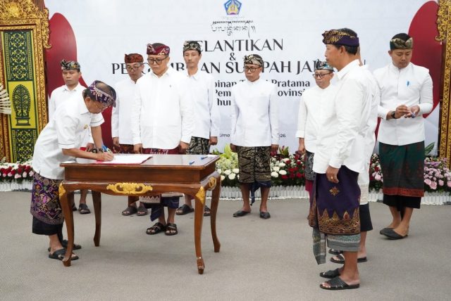 PIMPINAN TINGGI PRATAMA – Gubernur Wayan Koster melantik enam Pimpinan Tinggi Pratama di lingkungan Pemerintah Provinsi Bali di Gedung Wiswa Sabha Utama, Kantor Gubernur Bali pada Selasa (3/2/2025).